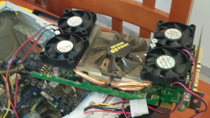 The answer is - create this monstrosity. I bought some hard drive cooling racks, disassembled the tiny fans, then took off the GPU’s plastic cover and screwed the tiny fans into the heatsink. You’d be surprised how effective it turned out.